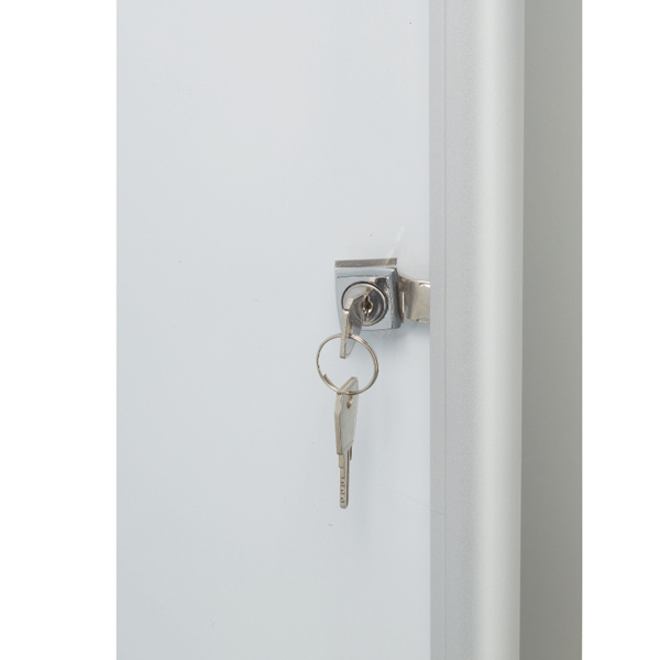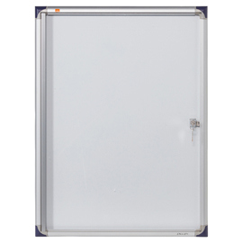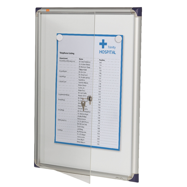 Bacheca extrapiatta per esporre comunicazione in corridoi e passaggi stretti. Cornice con profilo assottigliato in alluminio anodizzato con angoli in colore blu. Anta battente provvista di serratura con facciata in materiale acrilico. Fondo in metallo bianco per affiggere comunicazioni con l'utilizzo di magnetini o per scrivere con pennarelli a secco. L'anta si apre con un angolo di 135 gradi . Profondita' interna 11mm. Fornita con kit per il fissaggio. dimensioni est.: 510x680x22mm.