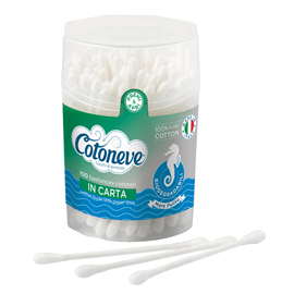 Barattolo in polipropilene da 100 bastoncini in cotone microbiologicamente controllati. Ideali per l'igiene quotidiana di tutta la famiglia. Composizione teste: cotone; Composizione bastoncino cotonato: carta. Lunghezza: 77mm; Colore:bianco.