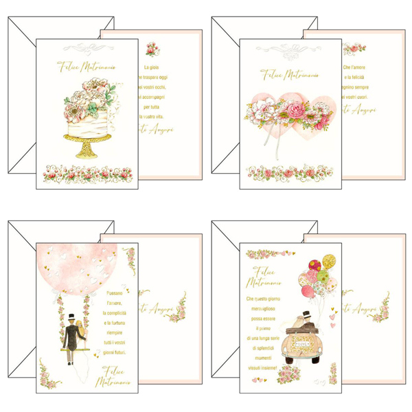 Biglietti doppi formato 11,7x17cm. Stampa offset su cartoncino liscio bianco. Blisterati 1 busta con 1 biglietto. Fantasie assortite.