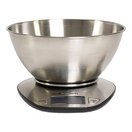 Bilancia da cucina digitale ad alta precisione, con ciotola in acciaio da 1,8L comodo e capiente per misurare anche i liquidi. Display LCD di grandi dimensioni 58x27 mm e funzione tara. Portata 5kg. Dimensioni: 21,5x21,5x13cm. Colore: silver. - Sensore ad alta precisione - Contenitore e corpo in acciaio - Misurazione del volume per acqua / latte / olio - Unita' di misura: gr/ml - Funzione tara - Volume contenitore 1.8L - Suddivisione: 1g - Indicazione sovraccarico e stato batterie - Spegnimento automatico - Visualizzazione orario quando non e' in funzione - Spegnimento automatico - Alimentazione a batterie: 2 x AAA.