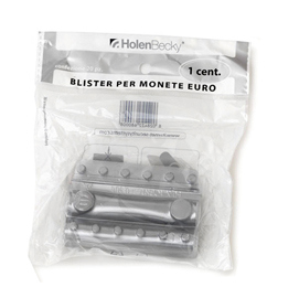 Blister portamonete euro in pvc riciclato 100% trasparente. Singolo blister colorato in modo differente per facilitare la distinzione tra i vari tagli di monete. Confezione da 20 blister per singola denominazione. In opp bag dotata di foro per espositore.