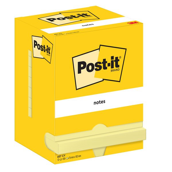 Blocco 100 foglietti Post-It 657 Notes classico Giallo Canary. Blocchetto per utilizzatori piu' esigenti. L'originale blocchetto adesivo riposizionabile da 100 fogli. Colore Giallo Canary. Formato 76x102mm. Lunghezza: 76mm. Altezza: 102mm. Grammatura 72gr. Linea Block Notes. Ogni blocco contiene 100 foglietti. Vendita di 12 Blocchi. Codice produttore 7100290168. Marca Post-it 3M.