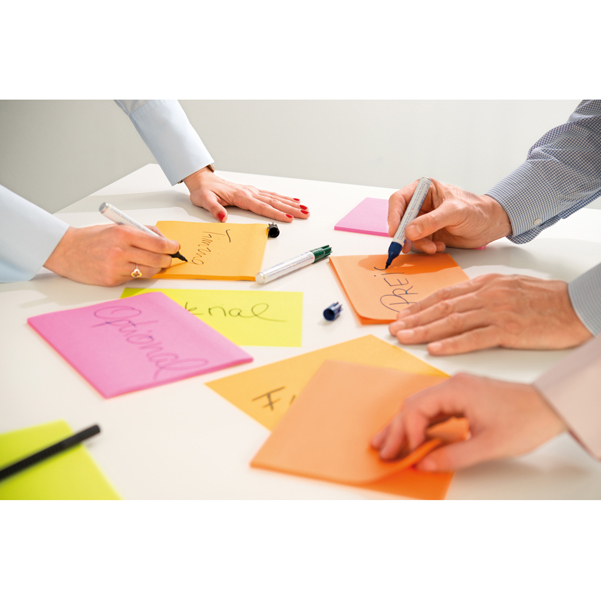 Blocchi da 30 fogli di fogli di grande formato (27,9x27,9cm) con adesivo post-it super sticky. Le loro dimensioni permettono di catturare idee e progetti da condividerle durante le riunioni. Soluzioni portatili per annotare pensieri del tuo team su superfici di grandi dimensioni. Aderiscono preticamente ovunque!.