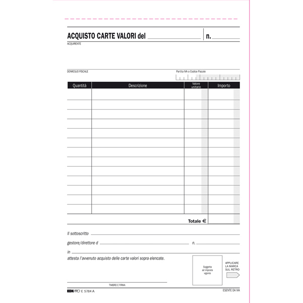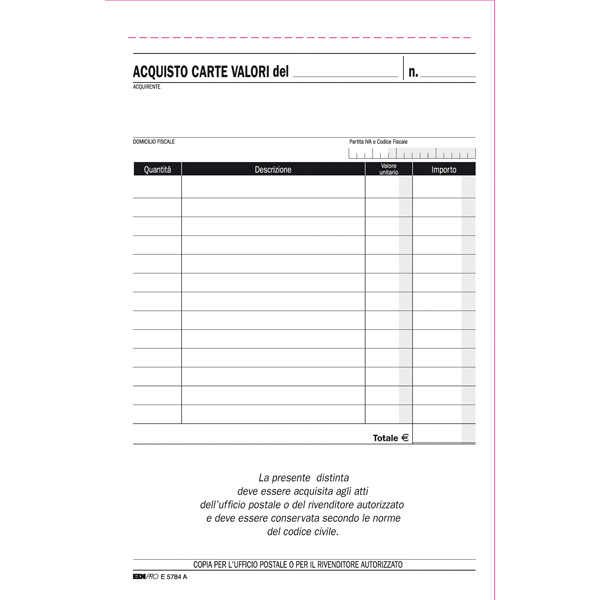 Blocco acquisto valori bollati. Formato 23x15cm. 50 fogli. 2 copie ricalcanti.