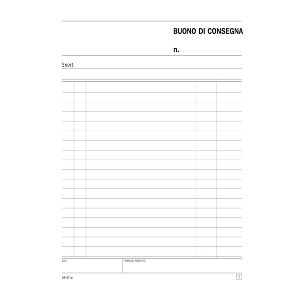 Blocco buoni di consegna 50 piu' 50 copie autoricalcanti DATA UFFICIO. Formato A5 (21x14,8cm). 2 copie ricalcanti. Blocco professionale. Carta chimica autoricalcante. Contiene 100 fogli (50+50 copie). Ottima qualita' del prodotto. Tipologia prodotto: Blocco buoni consegna. Carta autocopiante: si. Codice produttore: DU164570000. Marca Data Ufficio. Confezione 10 pezzi.