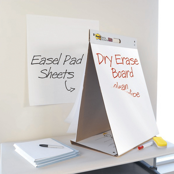 Blocchi da tavolo e da parete di fogli Post-it con adesivo rimovibile Super Sticky. Blocco da tavolo Post-it 563DE formato da 20 fogli. Dotato di struttura auto-portante con blocco da un lato e lavagna cancellabile dall'altro.