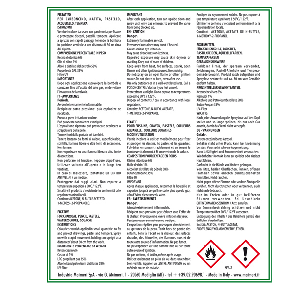 Vernice fissativa incolore fissa e protegge disegni, pastelli e tempere. Usare con parsimonia. Applicare a spruzzo con rapidi passaggi tenendo la bombola in posizione verticale a una distanza di 30cm circa dal disegno.