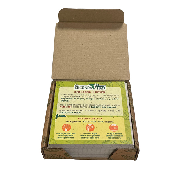 Maxiquaderno con rilegatura a punto metallico. Carta da 80 gr/mq. Copertina in cartoncino da 240 gr/mq. Prodotto totalmente in carta riciclata - Totalmente privo di plastica - 100% riciclabile. 20 fogli (80 facciate scrivibili) + risguardo. Confezione in cartone privo di plastica contenente 12 maxiquaderni rigatura 5mm c/margine + 6 scatoline di foglietti per appunti in omaggio (carta proveniente da rifili di lavorazione). Una linea di prodotti ecologici ad altissima grado di sostenibilita'. Prodotti con energia solare. 20 +1 fogli - expo 12 pezzi + 6 scatoline foglietti.