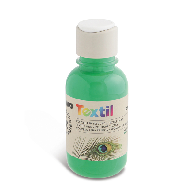 Colore per tessuto in bottiglia da 125 ml con tappo dosatore in espositore da 6 colori (vermiglione, giallo, blu oltremare, verde brillante, bianco e nero). Colore ad acqua ad alta concentrazione di resina e pigmento, una volta asciutto e' permanente sui tessuti. Non necessita di fissaggio ma deve essere lasciato asciugare perfettamente per almeno 24 ore. Stirare dal rovescio.