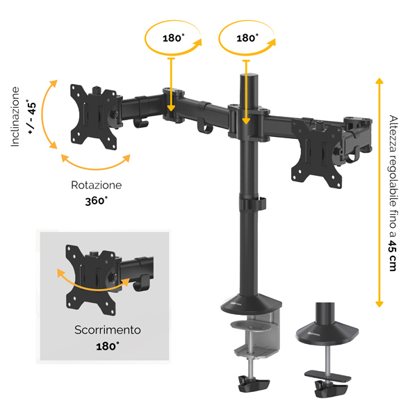 Braccio monitor con sistema di montaggio a morsetto o foro passante. Sistema a palo fisso. Regolabile in altezza fino ad un massimo di 450mm ed estensione di 428mm. Peso max monitor 8kg per ciascun braccio. Compatibilita' VESA.