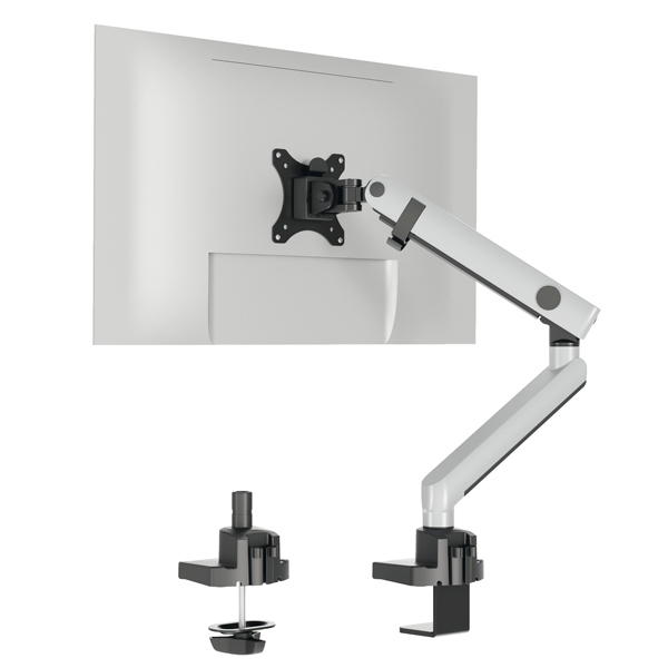 Braccio porta monitor per 1 monitor standard fino a 32'' e fino a 8 kg. Fissaggio tramite morsetto o perno per foro passacavo (entrambi inclusi nella confezione). Altezza, inclinazione e orientamento del monitor regolabili facilmente e individualmente per un lavoro ergonomico. Supporto universale VESA (75 x 75 mm o 100 x 100 mm). Facile installazione del monitor grazie al meccanismo ad innesto. Braccio dotato di molla meccanica che stabilizza il monitor. Gestione dei cavi: il cavo del monitor e' guidato lungo il supporto da una canalina interna e una clip passacavo, proteggendolo cosi' dalla rottura. Il monitor puo' essere ruotato di 90 gradi per lavorare in modalita' verticale o orizzontale (con meccanismo di bloccaggio). Monitor direzionabile di 180 gradi (+90 gradi /-90 gradi ). Il monitor puo' essere inclinato di 180 gradi (+90 gradi /-90 gradi ). Fissaggio con morsetto o perno per foro passacavo: per scrivanie da 10-50 mm. Materiali: alluminio, acciaio e plastica.