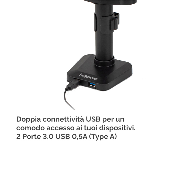Bracci monitor completamente regolabili con innovativa tecnologia a molle a gas per spostamenti e regolazioni senza sforzi del monitor. Il sistema ordinacavi tiene la scrivania in ordine, e la porta USB alla base permette di connettere fino a due dispositivi. Facile montaggio a morsa o tramite foro e ganascia. Varie configurazioni di schermi disponibili. Compatibilita' VESA - 75x75/100x100. Per scrivanie di spessore compreso tra 19 e 120mm. Peso max monitor: 9kg. Formato max monitor: 30"/76,2cm. Rotazione: