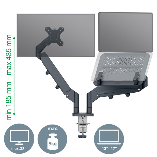 Braccio ergonomico doppio per monitor e laptop certificato IGR (solo per il monitor) e TUV, in grado di migliorare la postura, l'allineamento degli occhi e il comfort di collo e spalle quando l'altezza del monitor e del laptop sono regolati correttamente. Il design salvaspazio consente di montarlo in spazi ridotti, pur garantendo la massima profondita' di campo e un'ergonomia visiva ott imale. Il monitor e il laptop possono essere regolati in modo completamente indipendente l'uno dall'altro. Doppi bracci a molla per regolare facilmente l'altezza del monitor (185mm-435mm) o del laptop. Facile regolazione dell'altezza, della profondita' e dell'angolazione con una sola mano: +90 gradi /-90 gradi di rotazione a sinistra e a destra, fino a 180 gradi di rotazione orizzontale e verticale del monitor, +55 gradi /- 55 gradi di inclinazione dello schermo. Design robusto e stabile per supportare monitor piatti o curvi da 17-32" con un peso massimo di 9 kg (19,8 libbre) e laptop da 13-17" con uno spessore massimo di 2,4 cm. Facile da installare grazie alla piastra Vesa staccabile a sgancio rapido inclusa (75 e 100 mm) e al morsetto a C in gomma siliconica che ridurra' le vibrazioni e proteggera' la superficie della scrivania o al foro per il gommino (spessore della scrivania: 10-80 mm). Attrezzi per il montaggio e la regolazione inclusi. Il sistema di gestione dei cavi consente di organizzare i cavi del monitor per uno spazio di lavoro piu' ordinato. Dimensione:1120 x 110 x 600 cm.Peso 6,5kg."