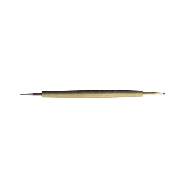 Bulino con doppia punta in acciaio ideale per sbalzo e embossing. Lunghezza 185mm. Diametro punta sfera grande 3,2mm, punta dritta 0,8mm.