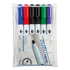 Pennarelli marcatore Tratto Memo con inchiostro cancellabile a secco per lavagne bianche. Busta 6 colori assortiti. Inchiostro a base d'alcool cancellabile a secco. Cappuccio ad apertura facilitata. Punta tonda da 2,5mm. Colori brillanti. Ottima cancellabilita'. Odore neutro. Materiale: plastica. Tipologia prodotto: marcatori per lavagne cancellabili. Marcatori. Punta: conica. Spessore del tratto: 1-2,5mm. Tipo inchiostro: base alcool. Confezione da 6 colori (blu, rosso, due nero, verde e viola). Codice produttore: 854200. Marca Tratto di Fila. Made in Italy.