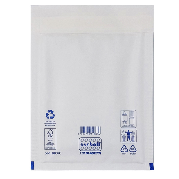 Sacco in carta bianca certificata FSC imbottito con pluriboll. Polietilene a bolle. Termosaldato su tre lati.Lembo autoadesivo protetto da Strip Dati tecnici: Modello: C Formato: 17X27cm Formato interno : 15X21cm Cartone certificato FSC.