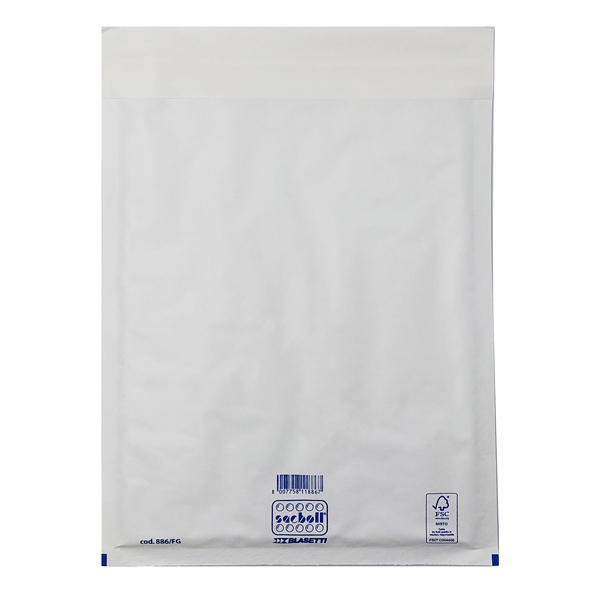 Sacco in carta bianca certificata FSC imbottito con pluriboll. Polietilene a bolle. Termosaldato su tre lati.Lembo autoadesivo protetto da Strip Dati tecnici: Modello: GF Formato: 25X39cm Formato interno : 22X33cm Cartone certificato FSC.