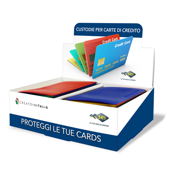 Espositore con porta carte di credito, schede telefoniche, tesserini di riconoscimento, nuovepatenti,viacard,tessere ACI, etc. In PVC morbido colorato.