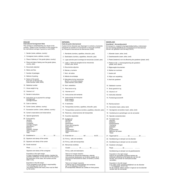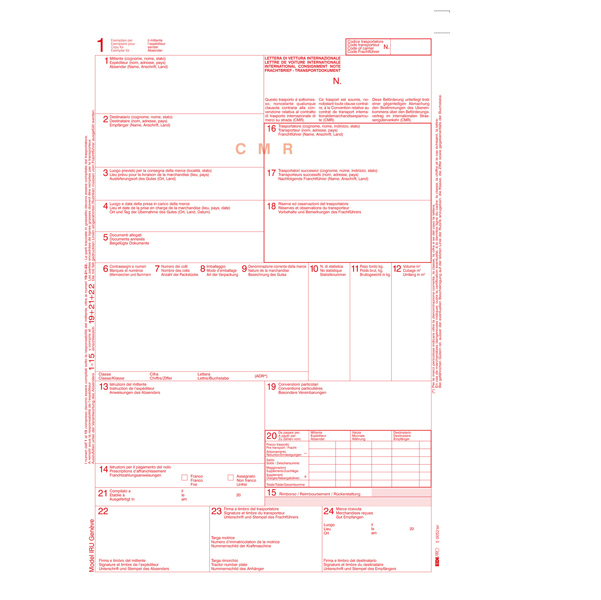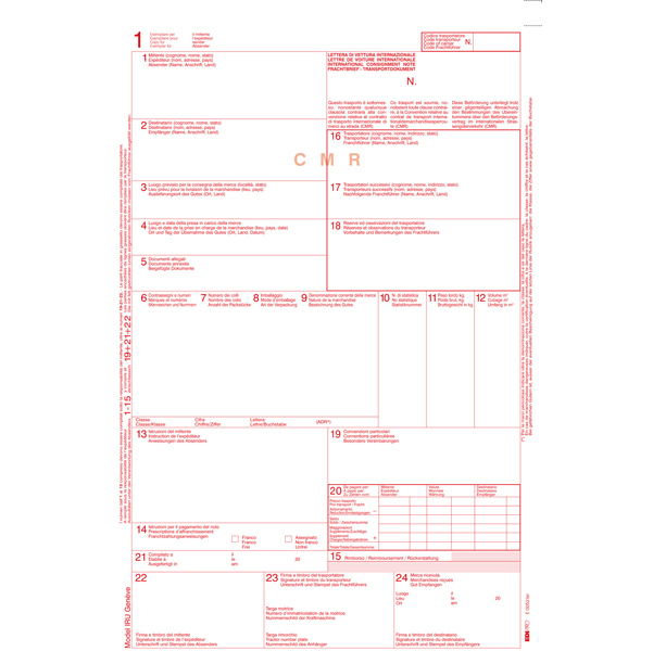 Lettera di vettura internazionale (modello CMR in modulo continuo) 5 copie snap autoricalcanti EDIPRO. Formato 29,7x21cm. 5 copie ricalcanti. Blocco professionale. Carta chimica autoricalcante. Contiene 50 fogli x 5 copie autoricalcanti. Ottima qualita' del prodotto. Tipologia prodotto: Convenzione internazionale relativa al trasporto internazionale di merci su strada. Carta autocopiante: si. Codice produttore: E0052TER. Marca Edipro.