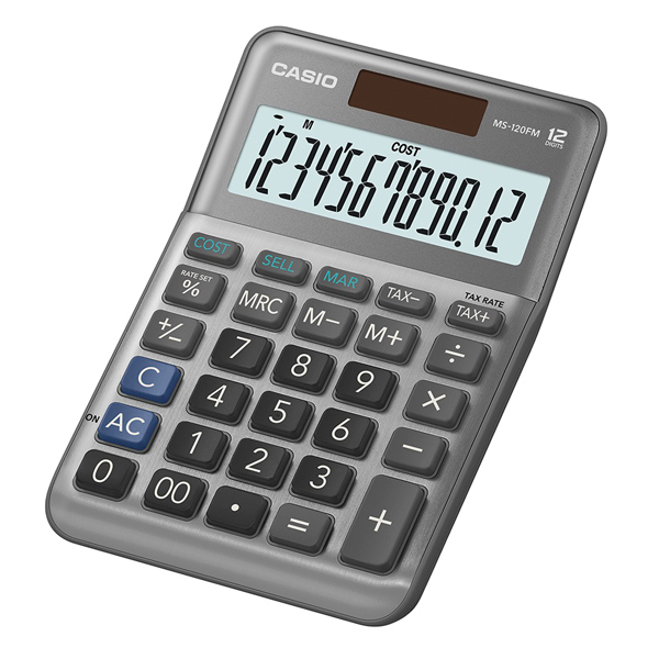 Calcolatrice da tavolo MS-120BM 12 cifre grigia Casio. Calcolatrice da tavolo con involucro in metallo. Display LC a 12 cifre. Tasti in plastica. Piedini in gomma. Doppia alimentazione solare e a batteria (1xLR1130). Calcolo percentuale incluso il margine di profitto. Calcolo delle imposte. Calcolo del profitto (costo, vendita, margine). 3 tasti memoria. Tasto simbolo +/-. Tasto doppio zero. Key rollover. Autospegnimento. Indicatore comando funzione. Memoria permanente e memorizzazione di costanti. Separatore di migliaia. Tipologia prodotto: calcolatrici da tavolo. Colore: grigio. Materiale: facciata in metallo. Dimensioni 28x10,1x14,9cm. Peso: 120gr. Alimentazione: solare e batteria (1xLR1130). Numero cifre: 12. Codice produttore: MS-120FM-WA-EP. Marca Casio.