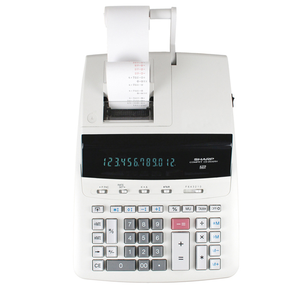 Calacolatrice grande professionale, 12 cifre digitron display, 2 colori di stampe a 4.5 linee/s, alim. a rete, conversione di valute, contatore di oggetti, premio/sconto (MU), scatola, grigia. ALIMENTATORE COMPRESO.