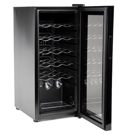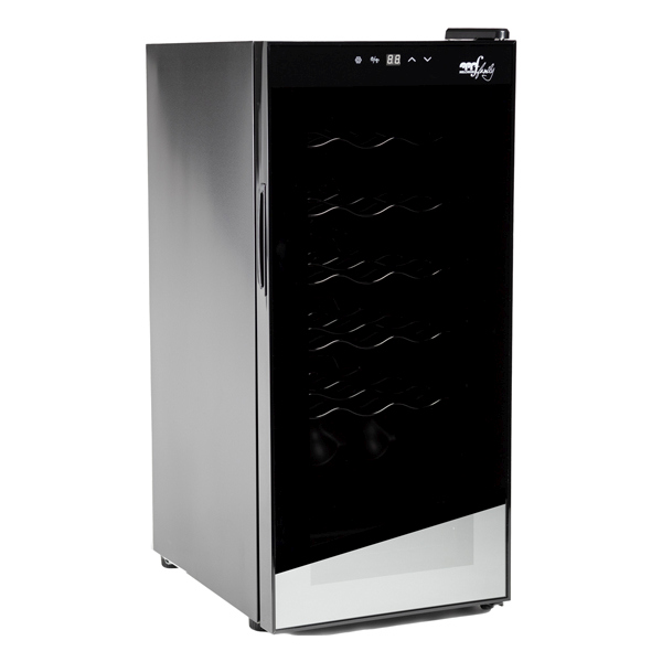 Cantinetta' con capacita': 18 bottiglie/ 50 litri. Sistema di raffreddamento con compressore. Luce interna a LED con autospegnimento dopo 10 minuti, che garantisce un risparmio energetico e consente una limitata produzione di calore per una migliore cura delle bottiglie. Regolazione della temperatura: 5-18 gradi C. Comandi soft touch. Porta in vetro temperato con filtro anti UV con protezione dai raggi ultravioletti. Rumorosita': 43 dB. Ripiani cromati. Piedini regolabili. Auto-defrost. Classe G. Alimentazione: 220-240V 50Hz. Potenza: 70W. Colore: nero. Dimensioni: 34,5x45x77cm.