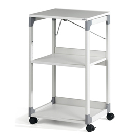 Struttura in acciaio verniciato con polveri epossipoliestere antigraffio e raccordi angolari in plastica resistente. 3 ripiani con mensola superiore regolabile in altezza. Se usato con proiettore 'overheads', la mensola puo' essere spostata leteralmente per appoggiare il proiettore sulla mensola centrale. Mensola centrale regolabile (passo 32cm) e mensola inferiore fissa. Ogni ripiano ha portata max 30kg. Dotato di 4 ruote pivottanti di cui 2 bloccabili. Dimensioni: L 508 X P 432MM - H 882MM.