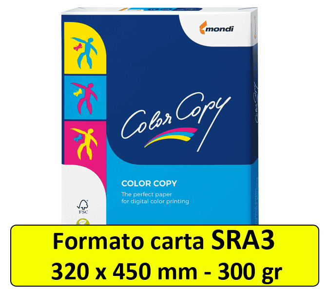 Carta Color Copy Sra3 da 300gr MONDI. Numero fogli per risma 125 di colore bianco. Carta Mondi. Carta Formato Sra3. Carta ad altissima qualita' per sistemi digitali e laser. Carta certificata FSC. Ecolabel. Trattata per l'utilizzo su stampanti laser a colori per garantire una stampa dai colori brillanti. Resistente al calore, non tossica. Colore Bianco. Formato Sra3 (32x45cm). Finitura Liscia. Grammatura: 300gr. Risma da 125 fogli. Tecnologia stampa Copy, laser, inkjet. Certificata ISO 9706. Codice produttore: 6394. Marca Mondi.