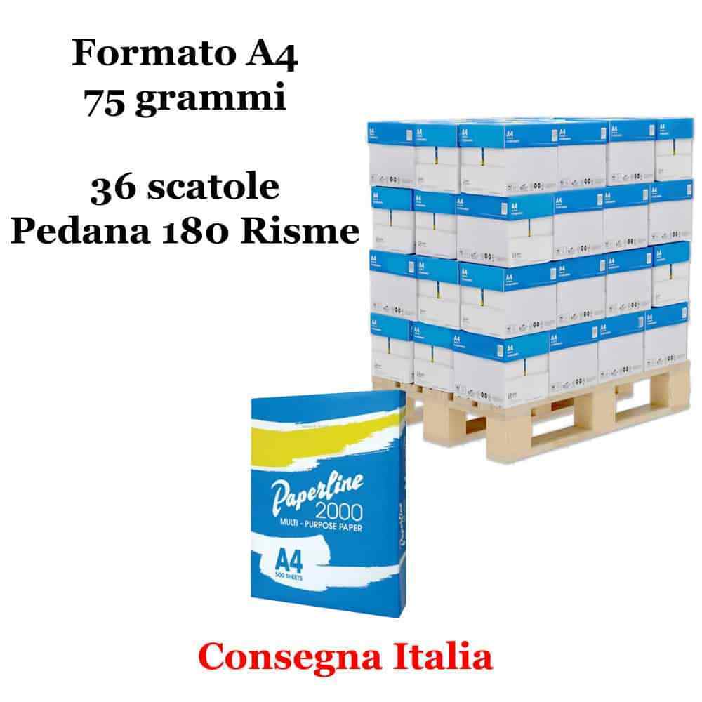 PAPERLINE 2000. Cartiera "APP", Indonesia. Carta bianca per stampanti multifunzione, 75 grammi (non dichiarati sul rifascio), formato A4. Scatole da 5 risme. Pedana da 36 scatole - 180 Risme. Paperline MCOPA4-180