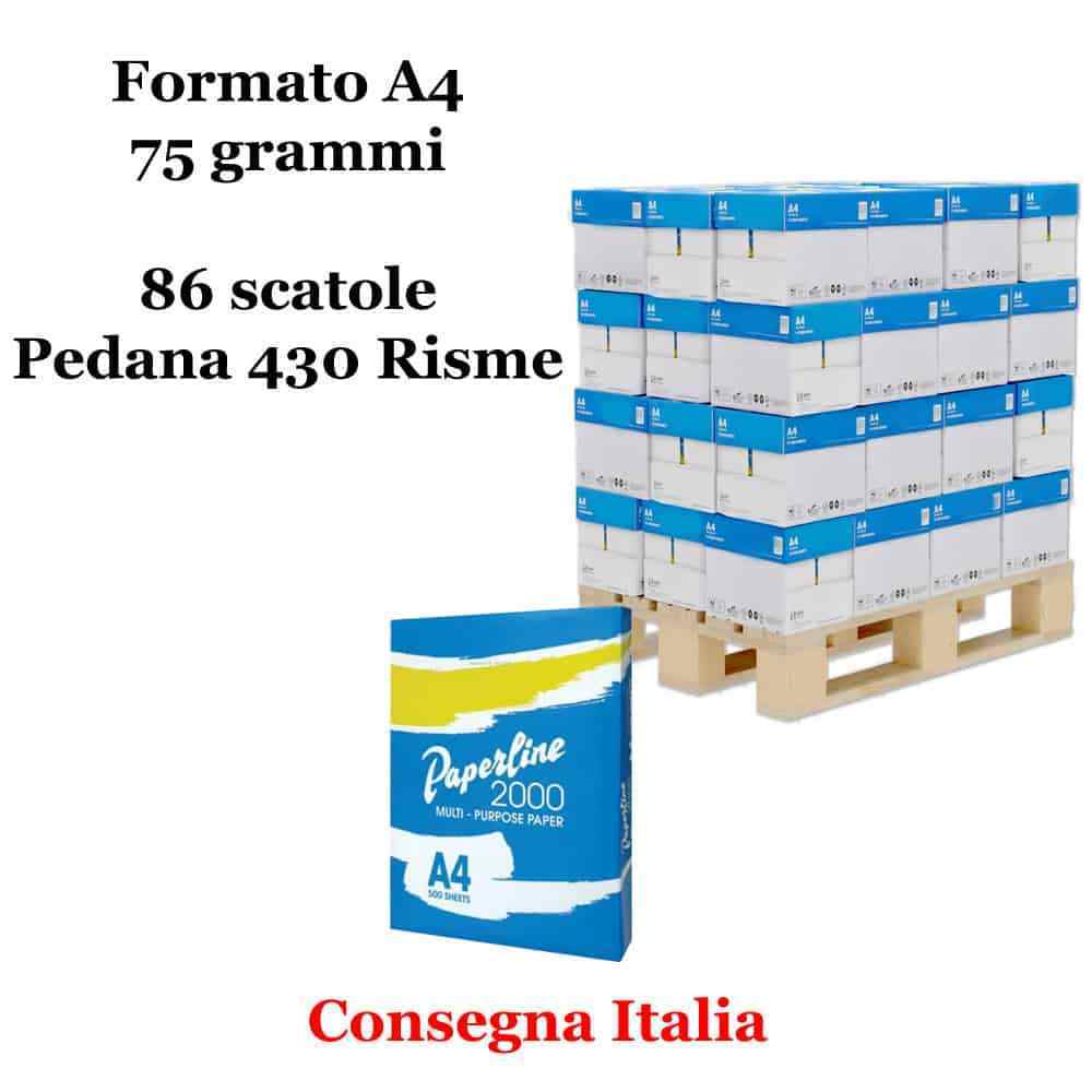 PAPERLINE 2000. Cartiera "APP", Indonesia. Carta bianca per stampanti multifunzione, 75 grammi (non dichiarati sul rifascio), formato A4. Scatole da 5 risme. Pedana da 86 scatole - 430 Risme. Paperline - MCOPA4-430