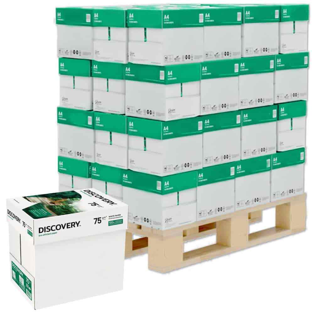 DISCOVERY 75. Cartiera "The Navigator Company".Carta bianca per stampanti multifunzione, 75 grammi, formato A4. Certificazione "EU Ecolabel". Scatole da 5 risme. Pedana da 86 scatole - 430 Risme. Discovery - DI75A4-430