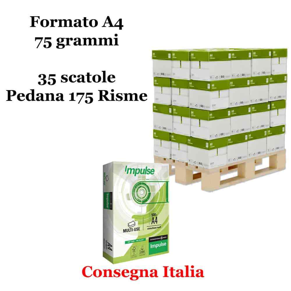 Rey Impulse. Cartiera 'International Paper'. Carta bianca per stampanti multifunzione - A4 - 75 gr (non dichiarati sul rifascio), formato A4. Punto di bianco 161(CIE). Certificazione 'EU Ecolabel' e 'FSC'. Scatole da 5 risme. Pedana da 36 scatole - 175 Risme. Scarico manuale da furgone al piano strada e Consegna al piano NON PREVISTA. Pallet da 35 scatole - 175 Risme - Rey Impulse - IMPA4-180.