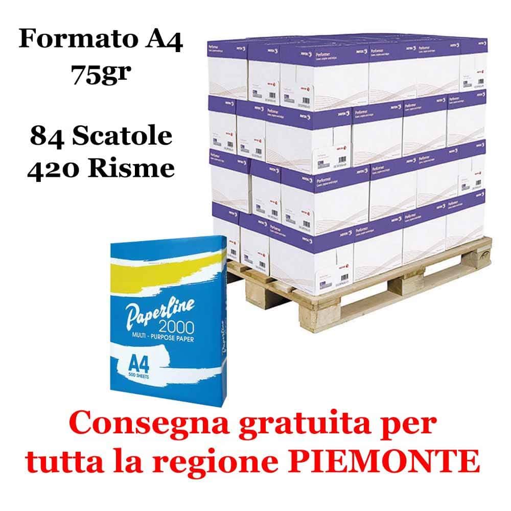 Carta bianca per stampanti multifunzione, 75 grammi (non dichiarati sul rifascio), formato A4. Pallet da 84 scatole. Scatole da 5 risme. 420 Risme da 500 fogli.