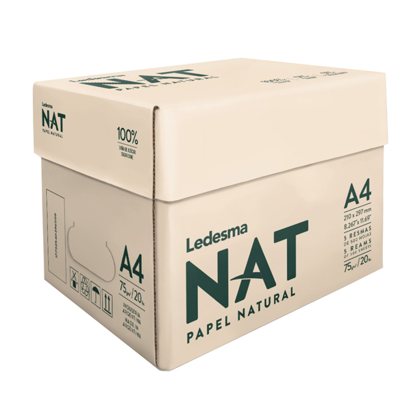Ledesma Nat e' una carta per ufficio super ecologica, prodotta al 100% con canna da zucchero, una materia prima sostenibile perche' cresce molto rapidamente. Coltivata nel nord dell'Argentina, ai piedi delle montagne, la canna da zucchero da vita ad una carta, leggermente ruvida in superficie, molto opaca, bellissima da usare, vedere e toccare. Certificazioni disponibili Yungas product certification e carbon footprint verifications. Confezione da 5 risme da 500fg. Materia prima: 100% canna da zucchero, 0% di fibre legno, 0% sbiancanti chimici Colore: canna da zucchero Formato: A4 - 21x29,7cm. Grammatura: 75gr Risma da 500 fogli Scatola da 5 risme.