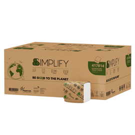 Carta igienica interfogliata (cod. 417814) a 2 veli e goffratura wave di colore bianco, realizzata in carta di pura cellulosa. Consente il prelievo di un foglio per volta ed e' la soluzione ottimale per tutti coloro che desiderano prevenire inutili sprechi, senza rinunciare alla qualita' del servizio. Rispetta la certificazione EU Ecolabel. Compatibile con dispenser cod. 100638. Numero servizi: 224 strappi; Altezza servizio (cm): 21; Lunghezza servizio (cm): 11; Dimensione piegato (cm): 11 x 10.5; Grammatura (g/metri quadrati): 15.5. Nuova gamma Simplify, la prima linea di prodotti Carbon Neutral nata con l'obiettivo di contribuire in maniera concreta e tangibile alla protezione globale del clima. Insieme a Climate Partner calcoliamo l'impronta ambientale dei prodotti Simplify nel loro intero ciclo di vita, andando a compensare le emissioni di CO2 prodotte sostenendo un progetto di protezione della foresta amazzonica a Labrea, in Brasile. Pack sostenibile realizzato in materiale termoretraibile riciclato. pacco da 224 strappi conf. 40 pezzi.