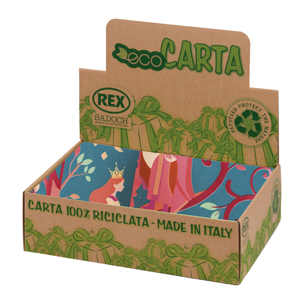 Carta da regalo patinata di grammatura superiore extra resistente 75-80gr/m2. Display da tavolo con 6 fantasie assortite.