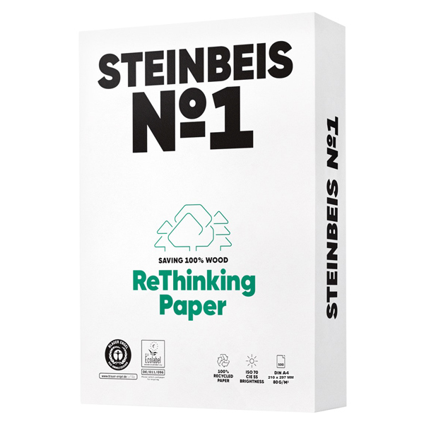 Carta riciclata post-consumer al 100%. Ha un un buon punto di bianco e pulizia di impasto in quanto per la produzione si utilizzano carte da macero selezionate provenienti da raccolte differenziate. Prodotta dalla cartiera Steinbeis e' disponibile nei formati A4 e A3. Spessore micron 102, opacita' 95%, bianco 70% Carta certificata Blue Angel.