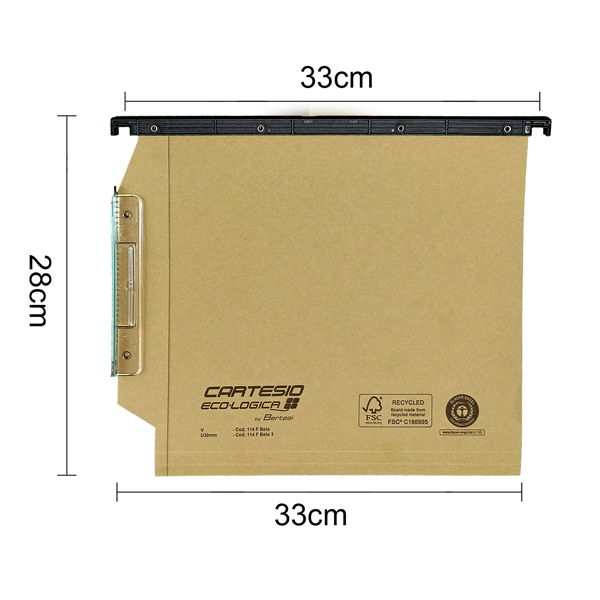 Cartelle sospese di ottima qualita', elevata convenienza e con i massimi requisiti in termini di sostenibilita' ambientale (dotate di doppia certificazione ecologica: FSC e Der Blauer Engel). Realizzate in robusto cartone ecologico (100% riciclato post-consumo) da 240 gr/m2 con resistentissime aste di sospensione ecologiche in polystirene nero antiurto (90% riciclato post-consumo). Sistema di assemblaggio tramite rivetti metallici che garantisce i massimi requisiti in termini di resistenza e durata. Portaetichette ad effetto lenticolare lungo 14 cm. dotato di sistema ad incastro per il collegamento in continuo delle cartelle in modo da prevenire eventuali perdite od errata classificazione dei documenti. Interasse 33 cm. Fondo ad U 3 cm. Colore: Avana Imballo ecologico realizzato con cartone 70% riciclato ed utilizzando colori ad acqua non nocivi per la stampa delle confezioni. Made in Italy.