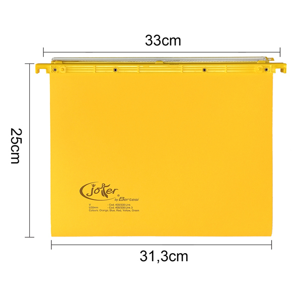 Cartelle Top di gamma, eleganti ed ecologiche. Fabbricate con i migliori materiali e le migliori tecniche produttive, sono garantite a Vita. I colori brillanti rendono piu' intuitiva e piacevole l'attivita' di consultazione dei documenti. Realizzate in cartone Kraft robustissimo (peso di 270 gr/mq.) ed ecologico (TCF). Aste di sospensione molto resistenti (spessore 6 mm.) in polistirene antiurto colorate nelle stesse varianti di colore del cartone per facilitare l'attivita' di archiviazione e velocizzare l'assegnazione dei documenti alle varie categorie logico-mnemoniche. Sistema di assemblaggio tramite rivetti metallici che garantisce i massimi requisiti in termini di resistenza e durata. Portaetichette gia' montato in plastica trasparente con effetto lenticolare (100% riciclato post-industriale) lungo 31 cm. Sistema di collegamento in continuo delle cartelle con bottoni a pressione per prevenire eventuali perdite od errata classificazione dei documenti. Etichette con bordo colorato per l'immediata individuazione dei fascicoli. Interasse 33 cm. fondo a V. Conf. 25 pezzi Colore Giallo