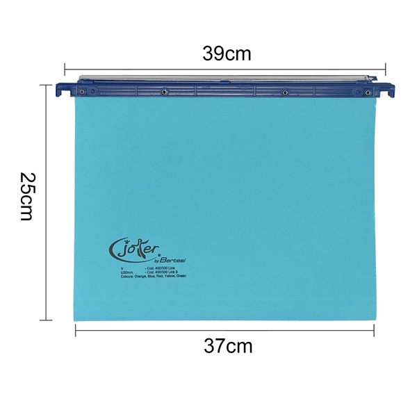 Cartelle Top di gamma, eleganti ed ecologiche. Fabbricate con i migliori materiali e le migliori tecniche produttive, sono garantite a Vita. I colori brillanti rendono piu' intuitiva e piacevole l'attivita' di consultazione dei documenti. Realizzate in cartone Kraft robustissimo (peso di 270 gr/mq.) ed ecologico (TCF). Aste di sospensione molto resistenti (spessore 6 mm.) in polistirene antiurto colorate nelle stesse varianti di colore del cartone per facilitare l'attivita' di archiviazione e velocizzare l'assegnazione dei documenti alle varie categorie logico-mnemoniche. Sistema di assemblaggio tramite rivetti metallici che garantisce i massimi requisiti in termini di resistenza e durata. Portaetichette gia' montato in plastica trasparente con effetto lenticolare (100% riciclato post-industriale) lungo 31 cm. Sistema di collegamento in continuo delle cartelle con bottoni a pressione per prevenire eventuali perdite od errata classificazione dei documenti. Etichette con bordo colorato per l'immediata individuazione dei fascicoli. Grazie ad uno speciale accorgimento nei ganci di sospensione, le cartelle interasse 39 cm possono essere utilizzate anche con i classificatori modello Olivetti di interasse 39,8 cm. Interasse 39-39,8 cm. Fondo a V. Conf. 25 pezzi. Colore Blu. Made in Italy.