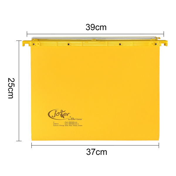 Cartelle Top di gamma, eleganti ed ecologiche. Fabbricate con i migliori materiali e le migliori tecniche produttive, sono garantite a Vita. I colori brillanti rendono piu' intuitiva e piacevole l'attivita' di consultazione dei documenti. Realizzate in cartone Kraft robustissimo (peso di 270 gr/mq.) ed ecologico (TCF). Aste di sospensione molto resistenti (spessore 6 mm.) in polistirene antiurto colorate nelle stesse varianti di colore del cartone per facilitare l'attivita' di archiviazione e velocizzare l'assegnazione dei documenti alle varie categorie logico-mnemoniche. Sistema di assemblaggio tramite rivetti metallici che garantisce i massimi requisiti in termini di resistenza e durata. Portaetichette gia' montato in plastica trasparente con effetto lenticolare (100% riciclato post-industriale) lungo 31 cm. Sistema di collegamento in continuo delle cartelle con bottoni a pressione per prevenire eventuali perdite od errata classificazione dei documenti. Etichette con bordo colorato per l'immediata individuazione dei fascicoli. Grazie ad uno speciale accorgimento nei ganci di sospensione, le cartelle interasse 39 cm. possono essere utilizzate anche con i classificatori modello Olivetti di interasse 39,8 cm. Interasse 39?À39,8 cm. fondo a V. Conf. 25 pezzi Colore Giallo.