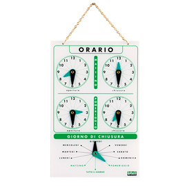 Cartello orario in acrilico con catenina in metallo per appendere. Formato 13x20cm.