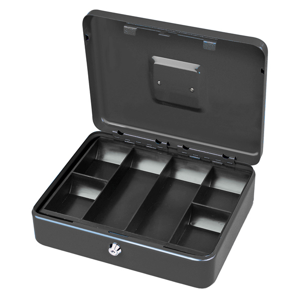 Cassetta portavalori Serie Secur in lamiera verniciata a polvere epissodica. Maniglia in acciaio nichelato incassata sul coperchio. Colore grigio. Serratura a chiave.