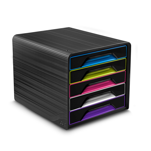 Cassettiere 5 cassetti impreziosite da texturing in rilievo per una finitura contemporanea e raffinata Custodia monoblocco molto robusta. Sovrapposizione superbamente stabile su piu' livelli. Tre diverse dimensioni di cassetto per permettere di alloggiare tutti i piccoli accesori necessari in ufficio, i documenti fino al formato 24x32cm e gli accessori voluminosi come hard disk, caricatori?à Cassetti intercambiabili (tranne i 1/2 cassetti) permetteranno una disposizione personalizzata. I cassetti sono dotati di maniglie ergonomiche, un foro di presa per facilitare la presa dei documenti contenuti e di blocco per evitare la fuoriuscita accidentale dalla cassettiera. Disponibili in colori opachi per preservare la riservatezza ed in colori trasparenti per visualizzarne rapidamente i contenuti. Formato utile : ?¢ cassetto 322 x 108 H 37 mm, cassetto standard 322 x 244 H 40 mm, cassetto maxi 322 x 244 H 85 mm. Piedini antiscivolo ed etichette di indentificazione del contenuto fornite. Realizzate in polistirene antiurto, riciclabile al 100%. Dimensione totale 360 x 288 H 271 mm.