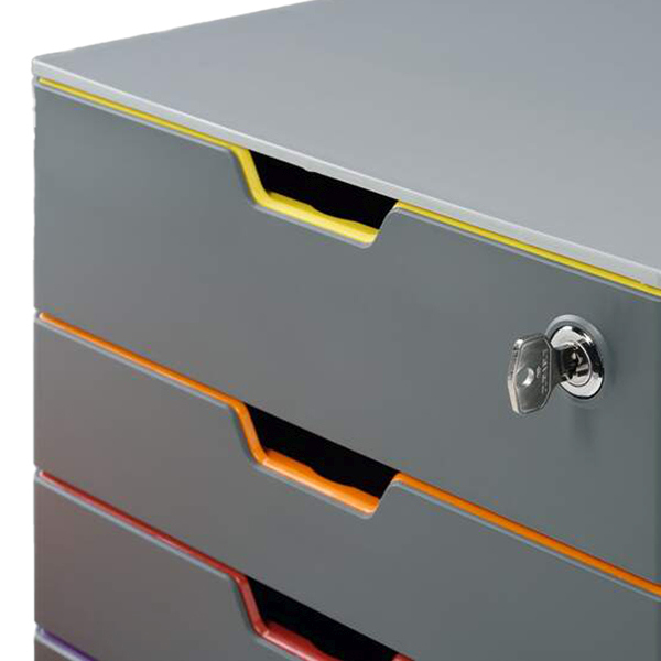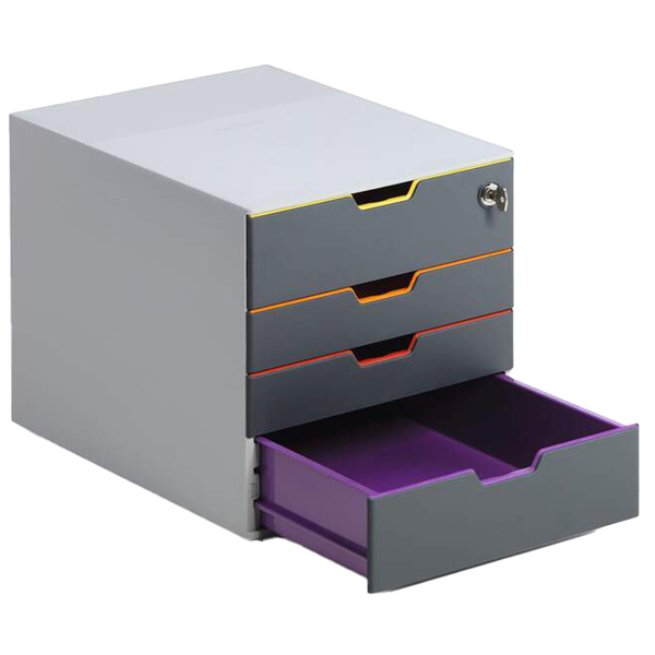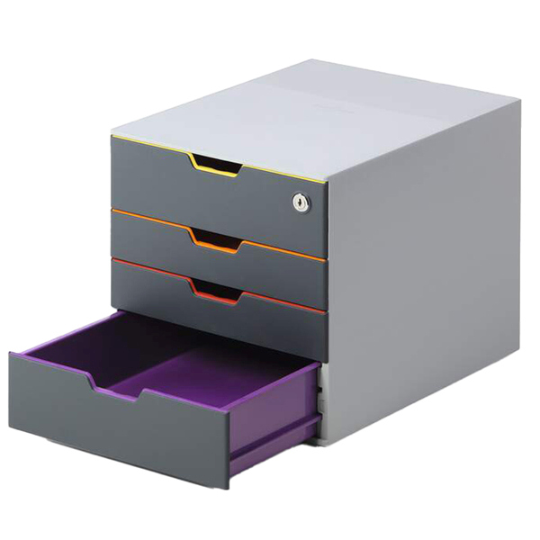 Cassettiera da scrivania con 4 cassetti, due ad alta capacita' di cui quello superiore dotato di serratura. Ideale per riporre documenti sia Formato A4 che Formato C4 (fino a 24 x 32 cm). Realizzata con materiali di alta qualita' che la rendono solida, robusta e durevole nel tempo. E' caratterizzata da un design ricercato e moderno e dai cassetti con profilo e interno colorato che offrono un supporto intuitivo per la catalogazione dei documenti e per l'organizzazione dell'ufficio. I cassetti possono essere rimossi e riposizionati secondo l'ordine di colori desiderato. Cassetti a scorrimento fluido e silenzioso, dotati di blocco di fine corsa che ne evita la fuoriuscita accidentale durante l'apertura. Nel fondo dei due cassetti piu' piccoli c'e' una fessura che agevola il recupero dei fogli inseriti, mentre sul frontalino e' presente un porta-etichetta rimovibile con cartoncino personalizzabile. Possono essere impilate e affiancate rimanendo perfettamente stabili grazie ai piedini antiscivolo di cui sono dotate. Cassetto superiore e cassetto inferiore formato XXL - maxi capacita'. Colore cassetti: giallo, arancio, rosso e viola. Dimensioni: 280 x 292 x 356 mm (LxHxP).