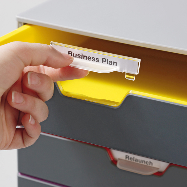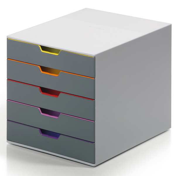 Cassettiere Varicolor a 5 cassetti solida e durevole, realizzata in materiali di alta qualit'. Design moderno e ricercato caratterizzato da cassetti con interno e profilo in 5 differenti colori, visibili anche a cassetto chiuso, che facilitano la classifi cazione del contenuto. Ogni cassetto, alto 5cm, dotato di fermo fine corsa e portaetichette personalizzabile e removibile. Impilabili e affiancabili. Dimensioni 28x35,6cm - H29,2cm.