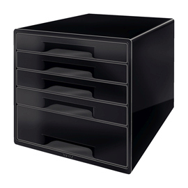 Cassettiera Black & White da 5 cassetti: 4 cassetti poco profondi + 1 cassetto alto per accessori da scrivania, come cucitrice, dispositivi mobili, ecc. Cassettiere impilabili fino a 3 moduli. Ergonomico buco presa nella parte inferiore del cassetti poco profondi per una facile rimozione dei documenti. Dimensioni utili: cassetti bassi L245x H34xP325mm, cassetto alto L245xH71xP325mm. Peso Kg3,59. Piedini in gomma. Dimensioni L287xH270xP363mm.