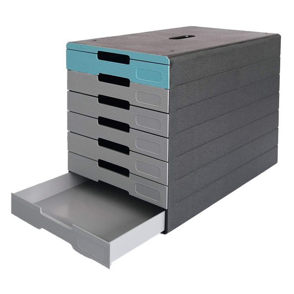 Cassettiera con 7 cassetti dotati di apposito spazio per l'etichettatura mediante etichette adesive incluse, personalizzabili a mano o con il software gratuito online DURAPRINT . Per documenti fino al formato C4 . Puo' essere etichettato con etichette adesive elaborabili al computer . Puo' essere riposta su scrivanie e scaffali oppure all'interno di armadi o mobili . Prodotto ecosostenibile certificato Blue Angel, realizzato per almeno l'80% con materiale riciclato post consumo.