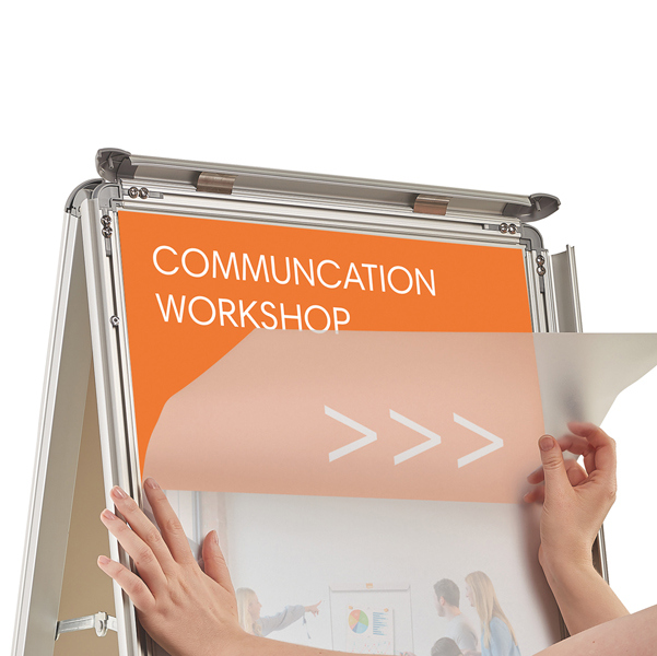 Stabile e resistente, ideale per esporre poster, offerte sia all'interno che all'esterno. Il materiale esposto puo' essere cambiato semplicemente sollevando le 4 parti laterali che formano la cornice. Il foglio di protezione in pvc anti-riflesso protegge il materiale esposto da polvere e sporco. La cornice in alluminiolarga 32mm. Struttura in acciaio robusta e stabile.