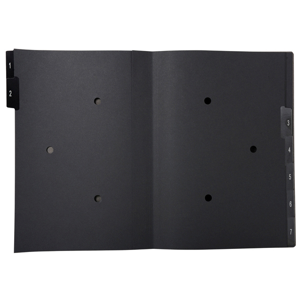 Copertina in cartone riciclato rigido 1.3 mm e tasti stampati. Interno in carta riciclata nera 270 g/mq con 2 fori per visualizzare il contenuto. Formato 25x33 cm per documenti A4.